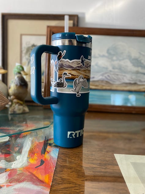 I’m super pleased to tell you that my water bottle stickers are in! I’m so glad they made it before the Wild Wings event and the spring migration. They’re 11” x 3” and made of colorfast vinyl. I put mine on y water bottle and went to town adding my bird stickers. See?